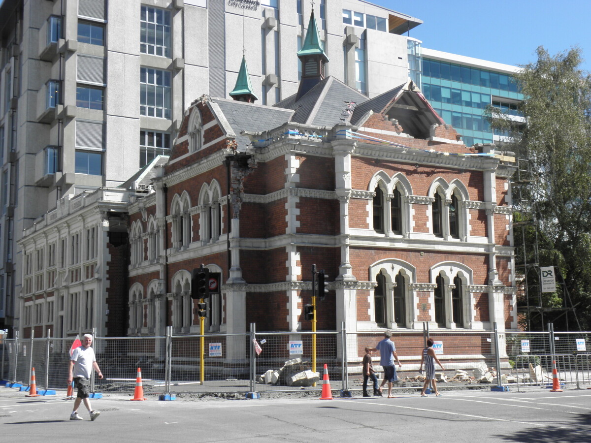 Damaged gable and roof on the former Canterbury Public Library Building, 107 - 109 Cambridge Terrace.