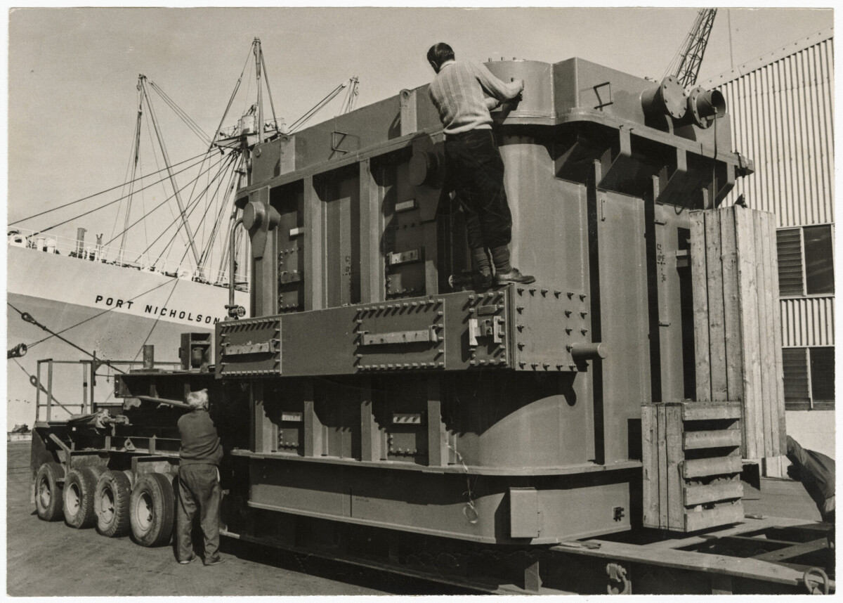 An electrical unit being unloaded at Lyttelton, destined for Islington. At 81 ton, this is the heaviest single lift to come ashore.