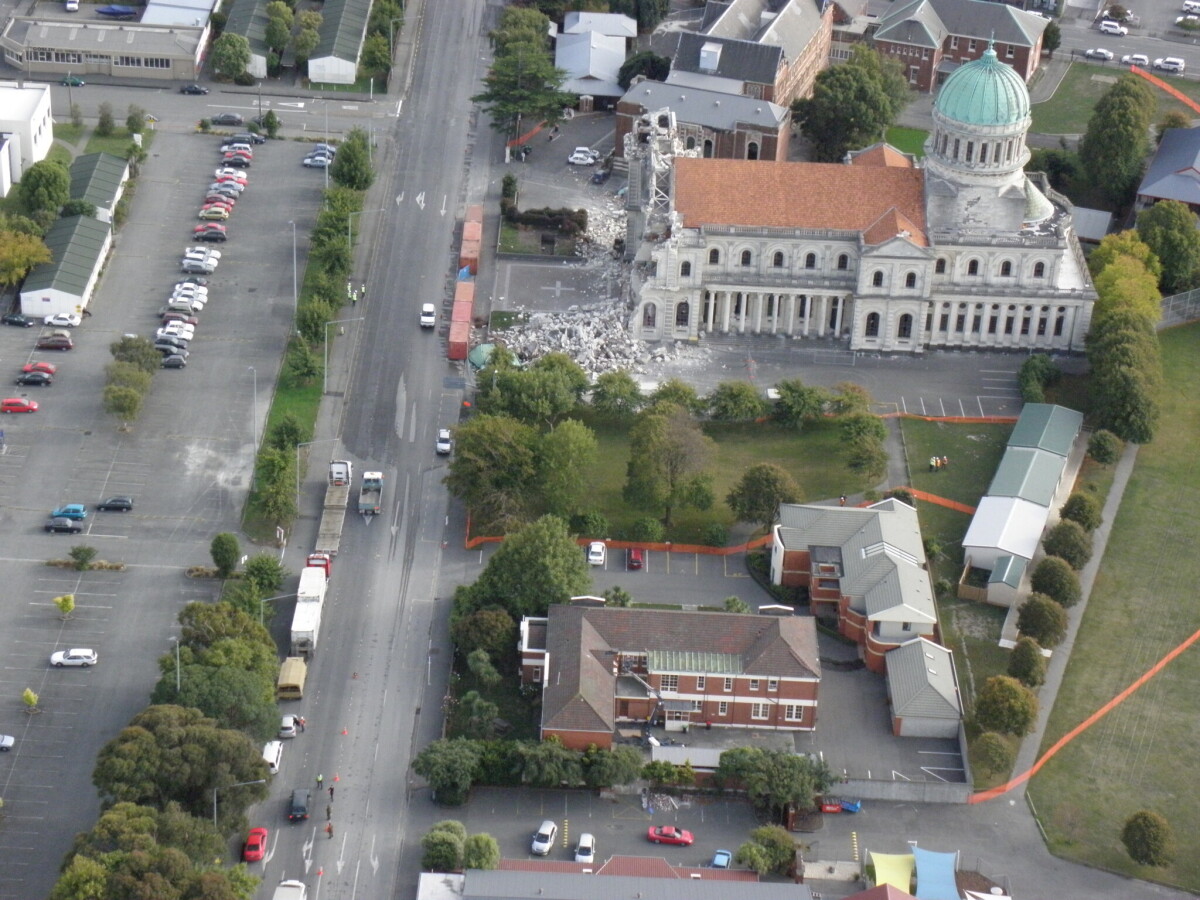 The damaged Catholic Cathedral (Cathedral of the Blessed Sacrament), Barbadoes Street.
