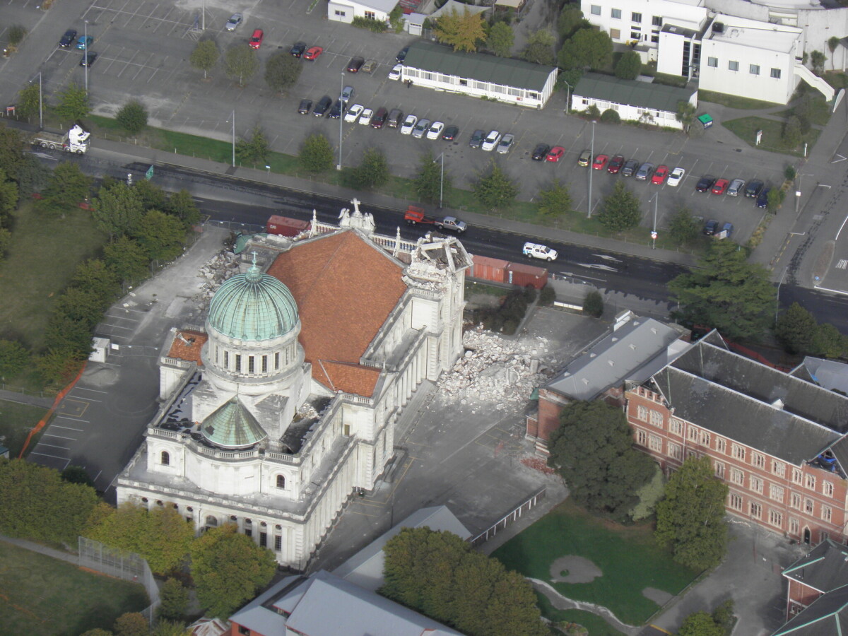 The damaged Catholic Cathedral (Cathedral of the Blessed Sacrament), Barbadoes Street.