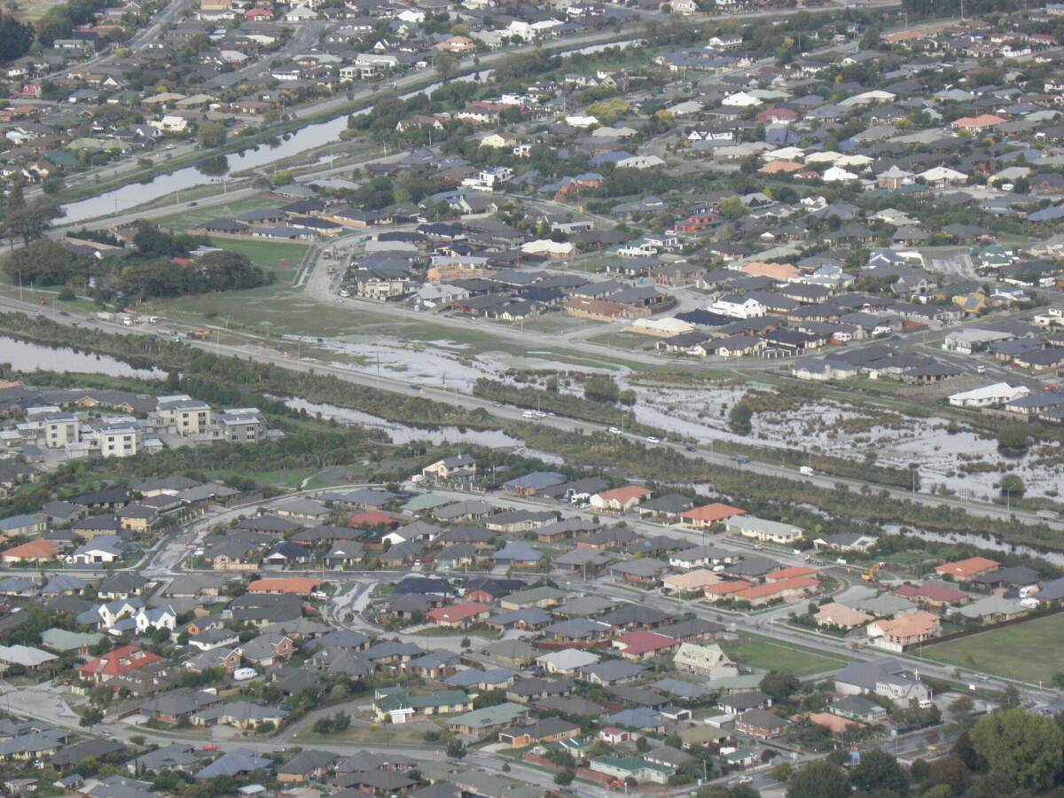 Aerial photograph showing the effects of liquefaction and surface water evident in Bexley.