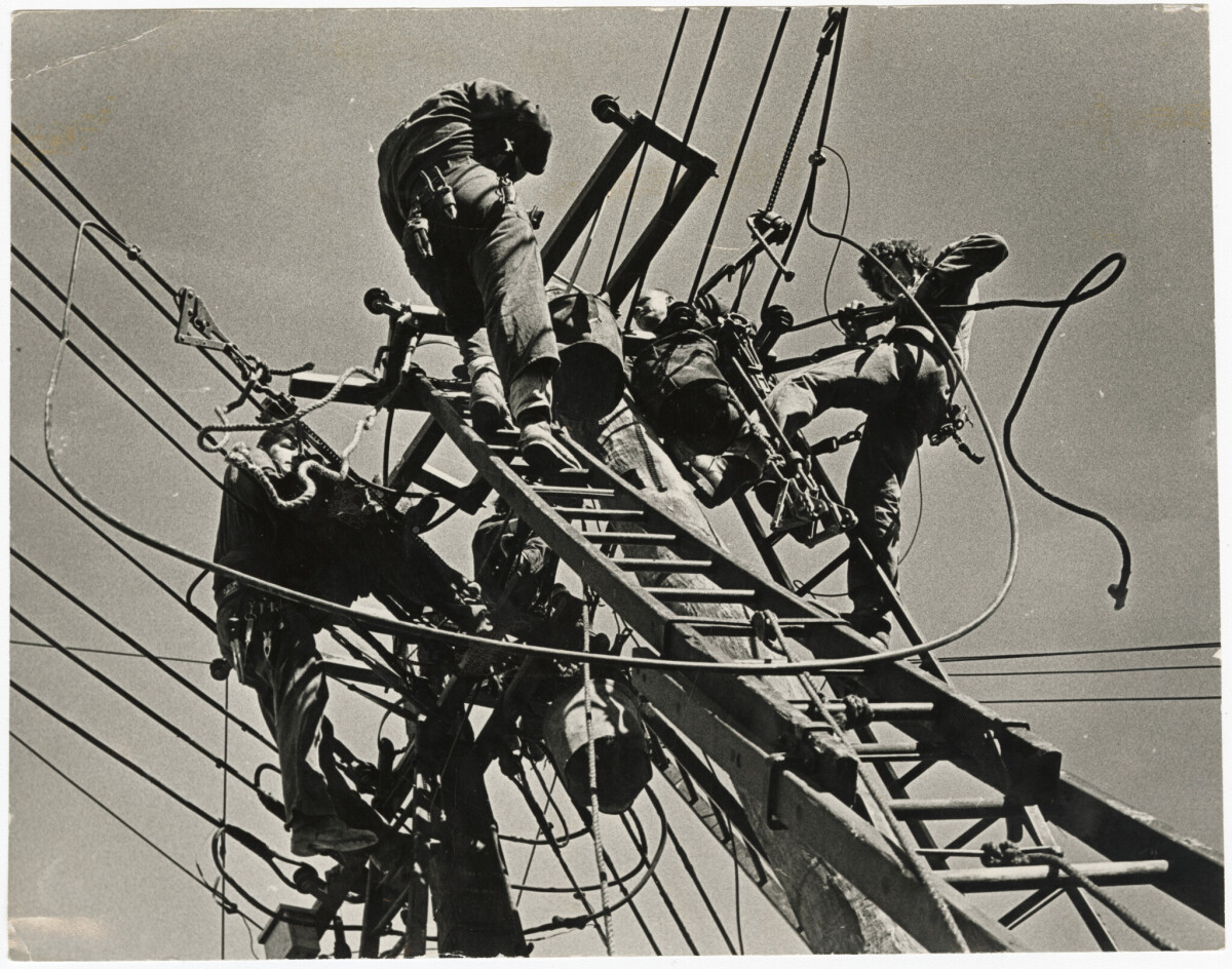 Municipal Electricity Department workers transferring powerlines from one pole to another at the junction of Kilmore and Durham streets.