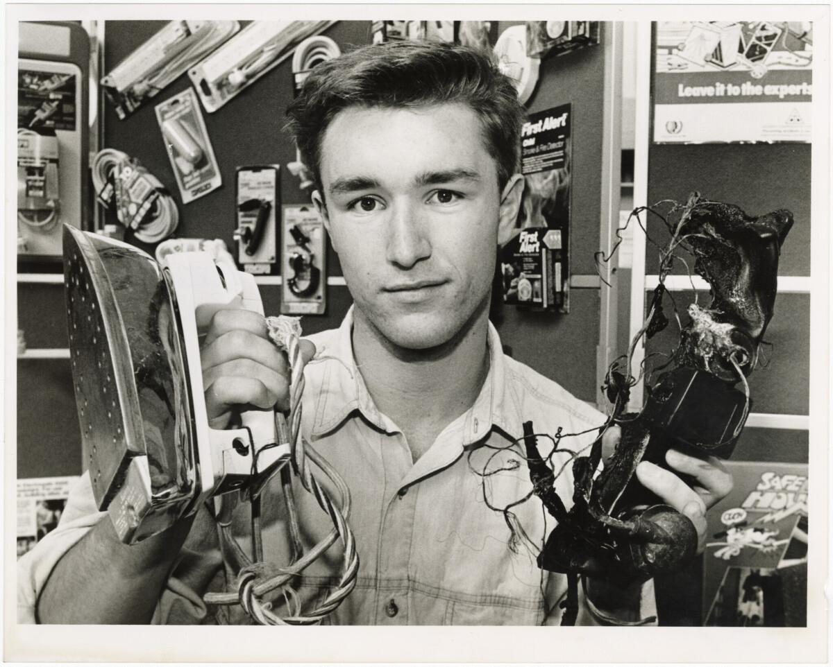 Southpower electrical apprentice, Glen Harris, with damaged electrical goods at a display at Linwood Mall.