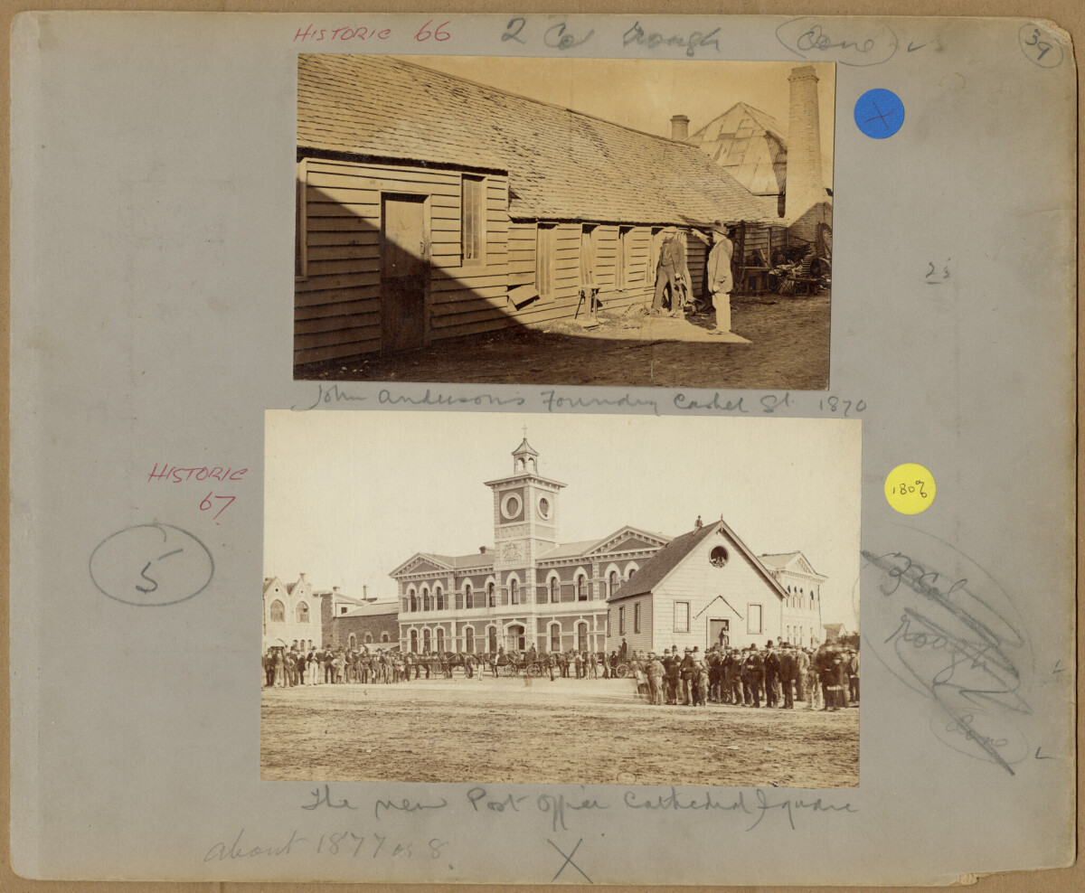 Two sets of photographs of central Christchurch. No.1 is of John Anderson's Foundry on Cashel Street in 1870. No.2 is of the new central Post Office in Cathedral Square in c1877.