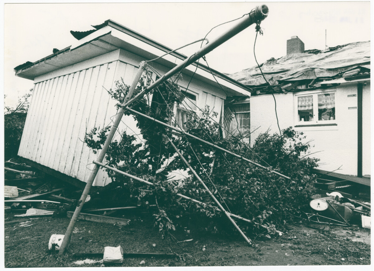 A sleepout upended by the tornado and deposited against the back wall of a house in Halswell Junction.