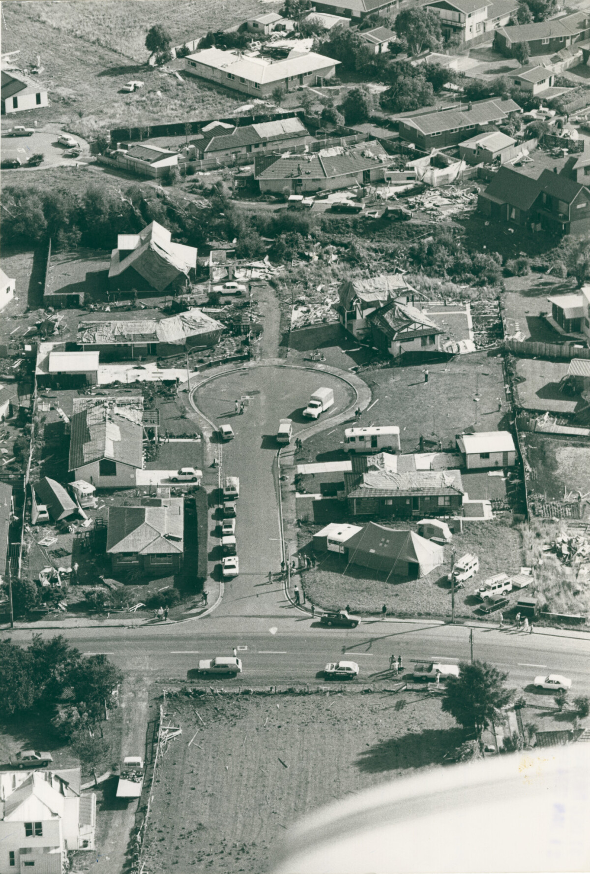 Aerial view of the tornado damage to Kinrara Place, Halswell.