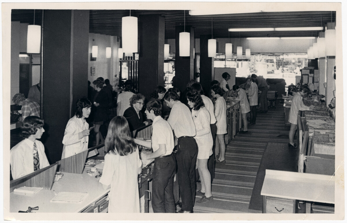 Interior of the Canterbury Savings Bank central city branch on Colombo Street with tellers at work serving customers.