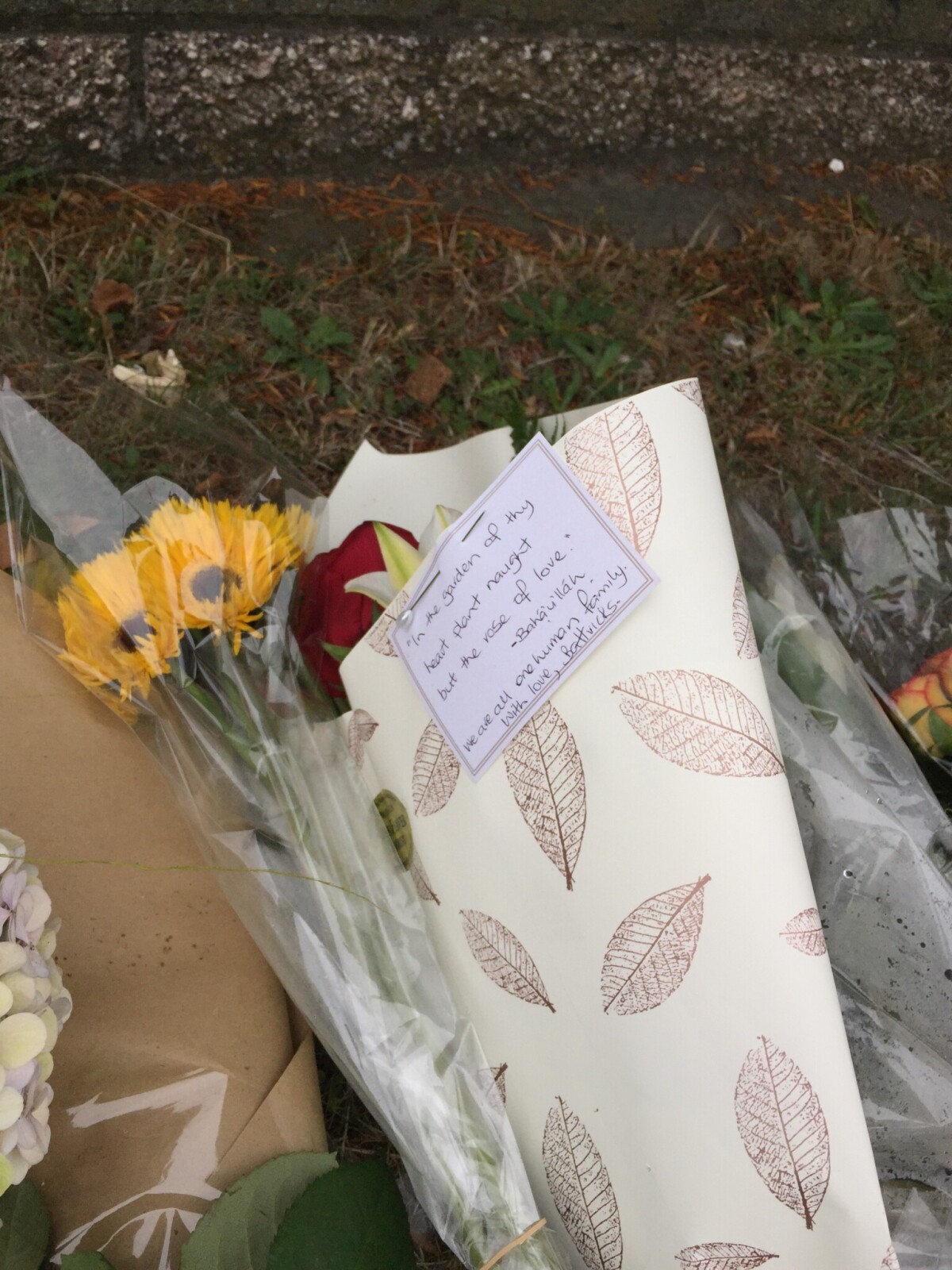 Flowers with a message of support on LInwood Avenue near Hereford Street for the victims of terrorist attack on Linwood Mosque. Card on a bouquet reads ' "In the garden of thy heart plant naught by the rose of love" - Baha'u'llah / We are all one human family. With love, Battricks'