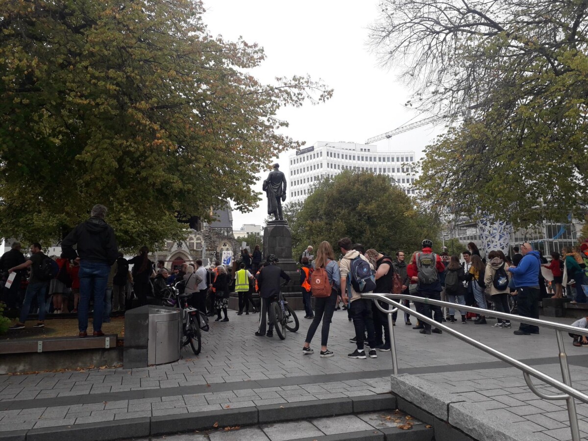 Edge of the student strike for climate change in Cathedral Square. The Godley Statue and Cathedral can also be seen.