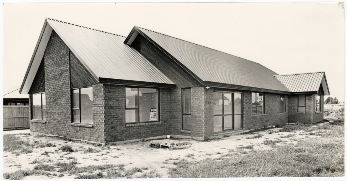 Exterior of a newly built brick house by Hyde Park in Avonhead with a for sale sign in the window.