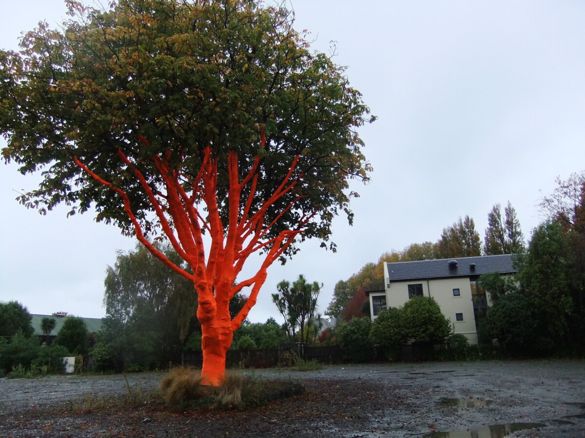 This tree decorated with orange hi-vis gear at 244 Manchester Street was designed as a commemorative artwork by Peter Majendie.