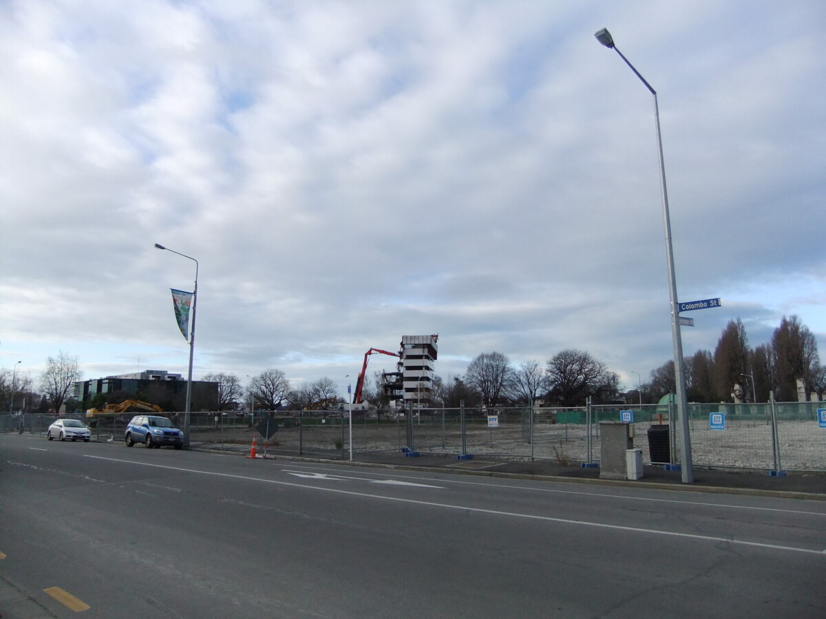 Cleared site on Colombo and Armagh Street interection with the demolition of the Ernst & Young building on Cambridge Terrace in the distance