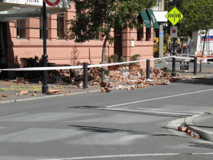 Collapsed masonry parapet on Café Roma building.