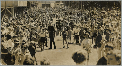 Crowds of children waiting for the Hays Christmas parade to pass ...
