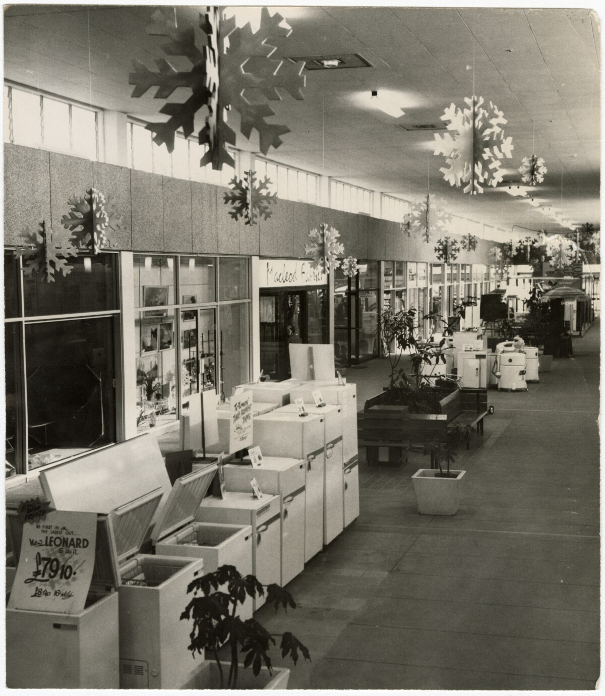Interior view of Riccarton Shopping Mall during an electrical appliance show in the main foyer.