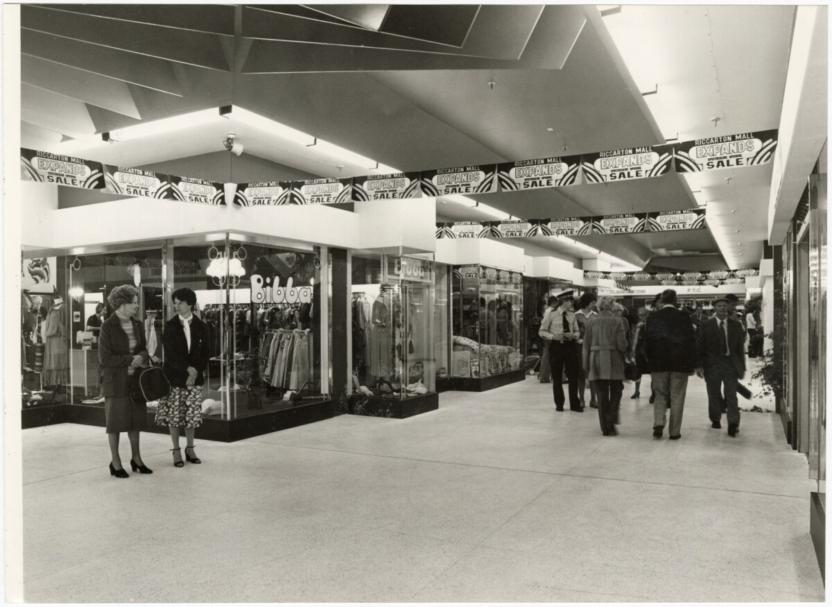 Interior view of Riccarton Shopping Mall and of shoppers browsing.