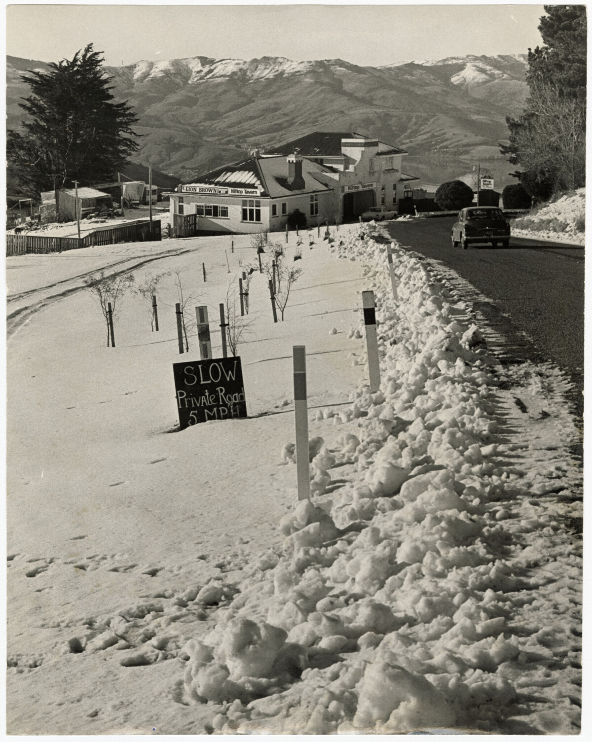 Scene looking along the Christchurch-Akaroa Road towards the Hilltop Hotel and Tavern, surrounded by snow.