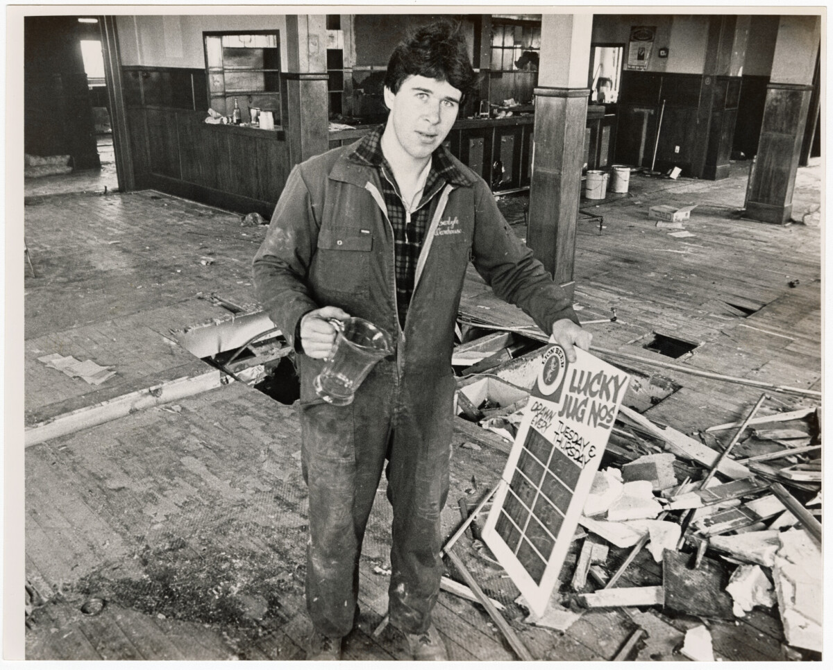 Interior of the Eastern Tavern bar area on the corner of Cashel Street and Fitzgerald Avenue during demolition. Pictured is contractor Tony Rogatski with a pitcher and sign from the site.