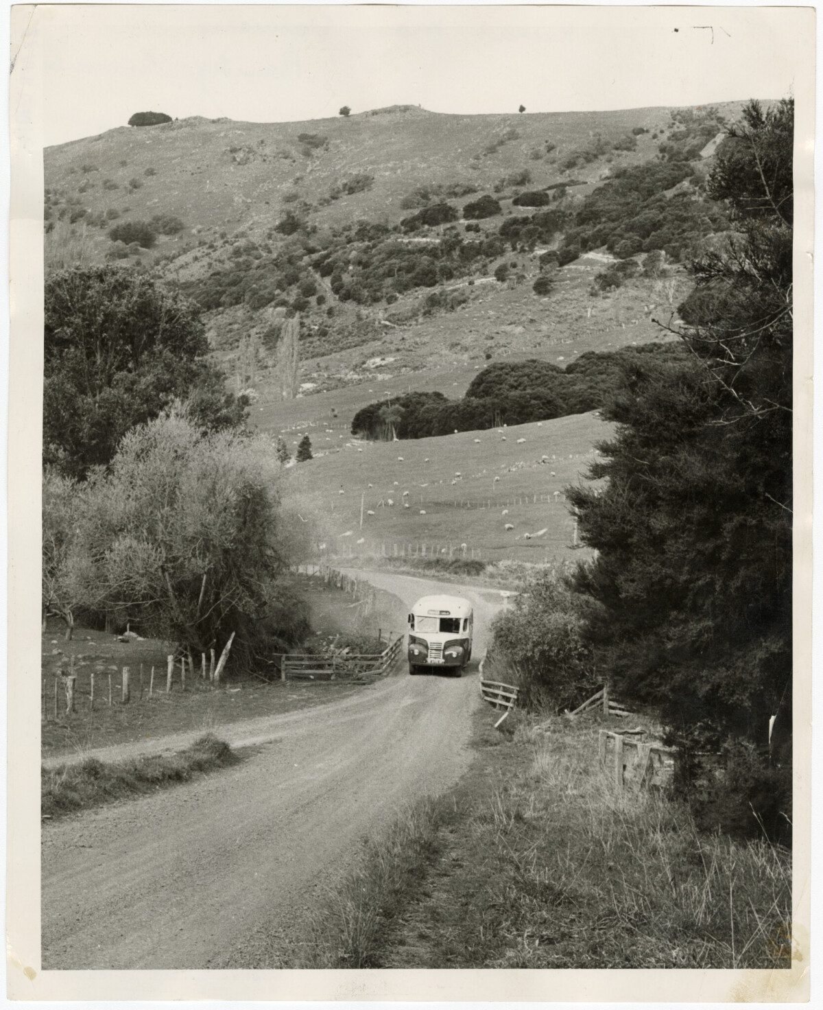 View of a rural mail delivery bus travelling on a rural road near Pigeon Bay on the Banks Peninsula.