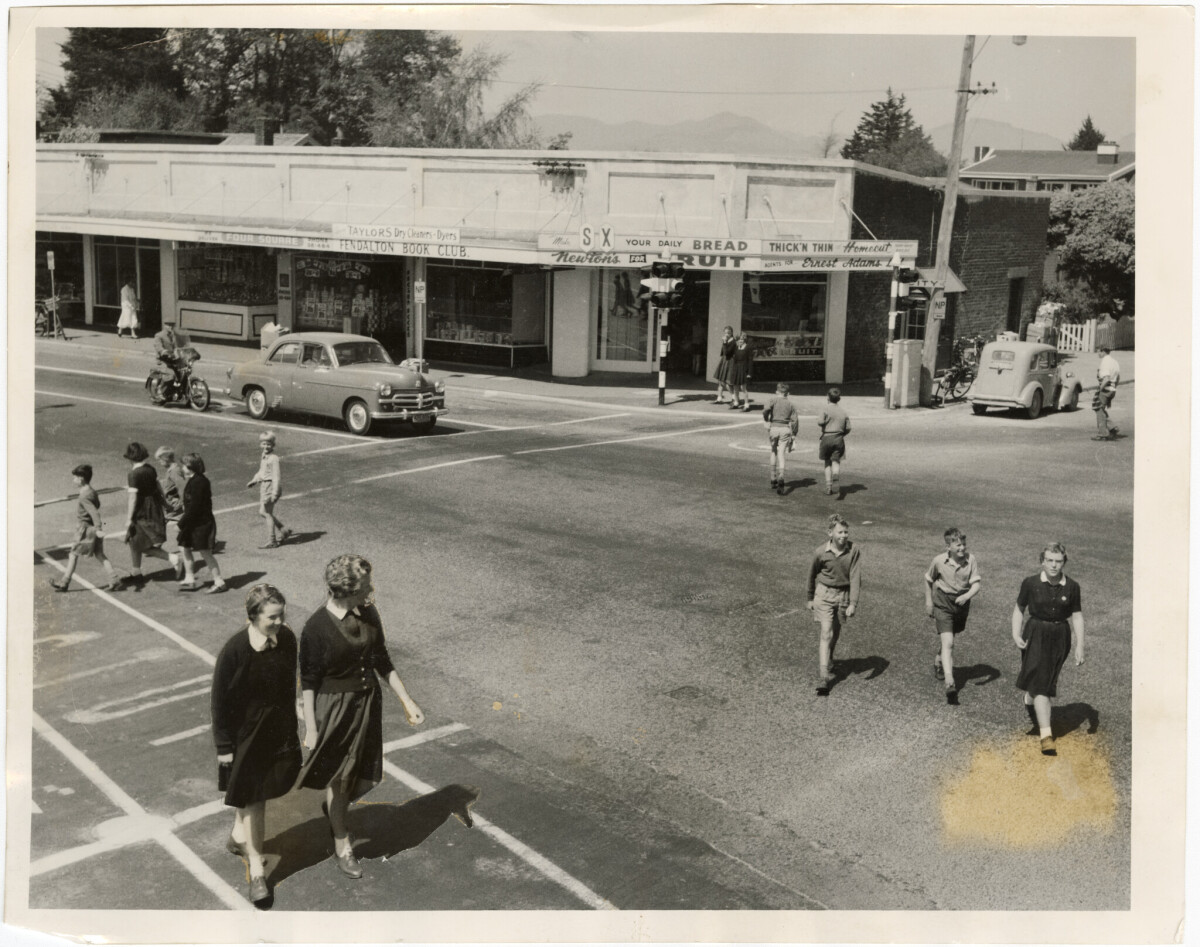 Schoolchildren crossing the intersection at Fendalton Road, Clyde Road and Memorial Avenue.
