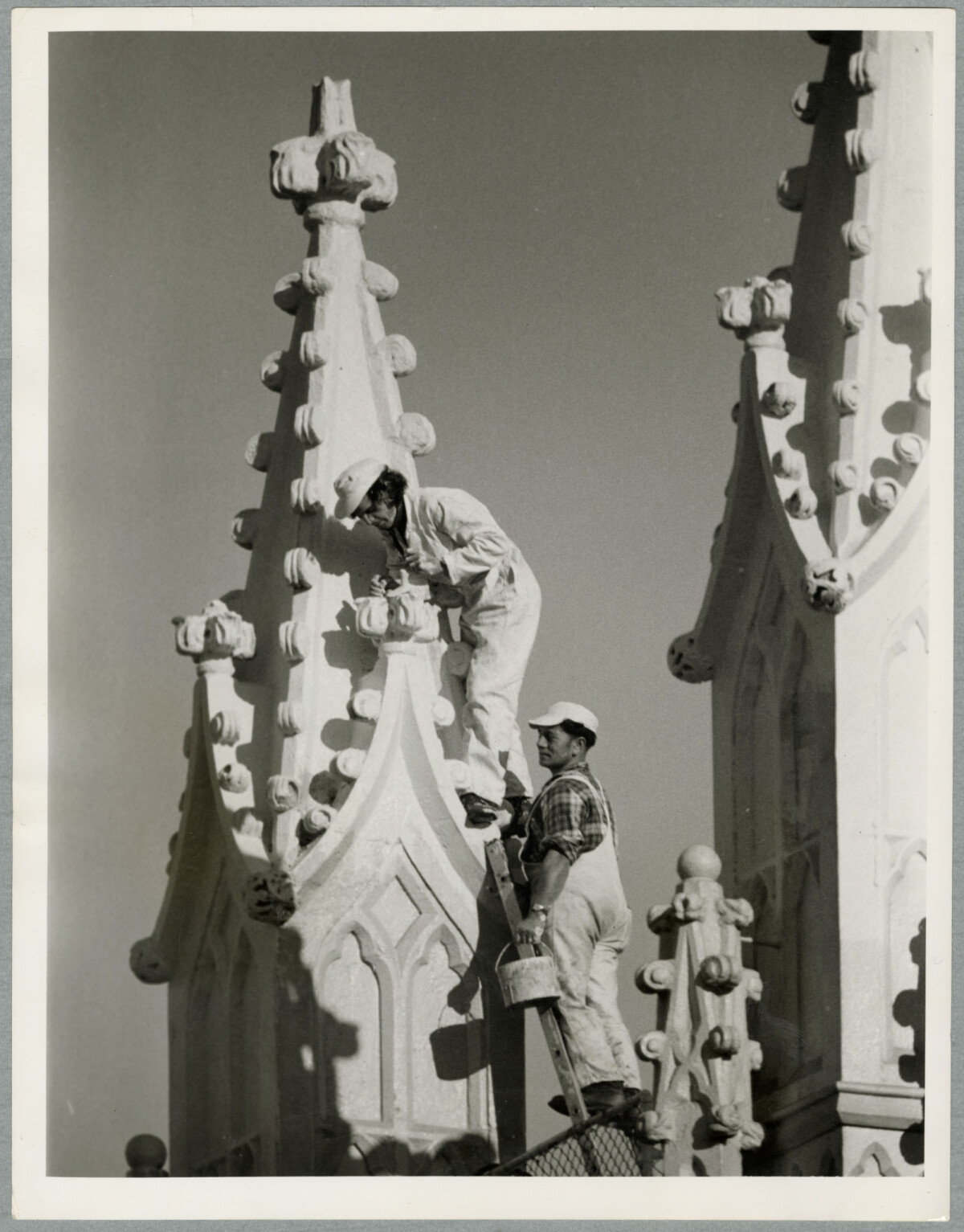 Two Christchurch painters working at the top of the tower at St Mary's Anglican Church on Church Street, Timaru.