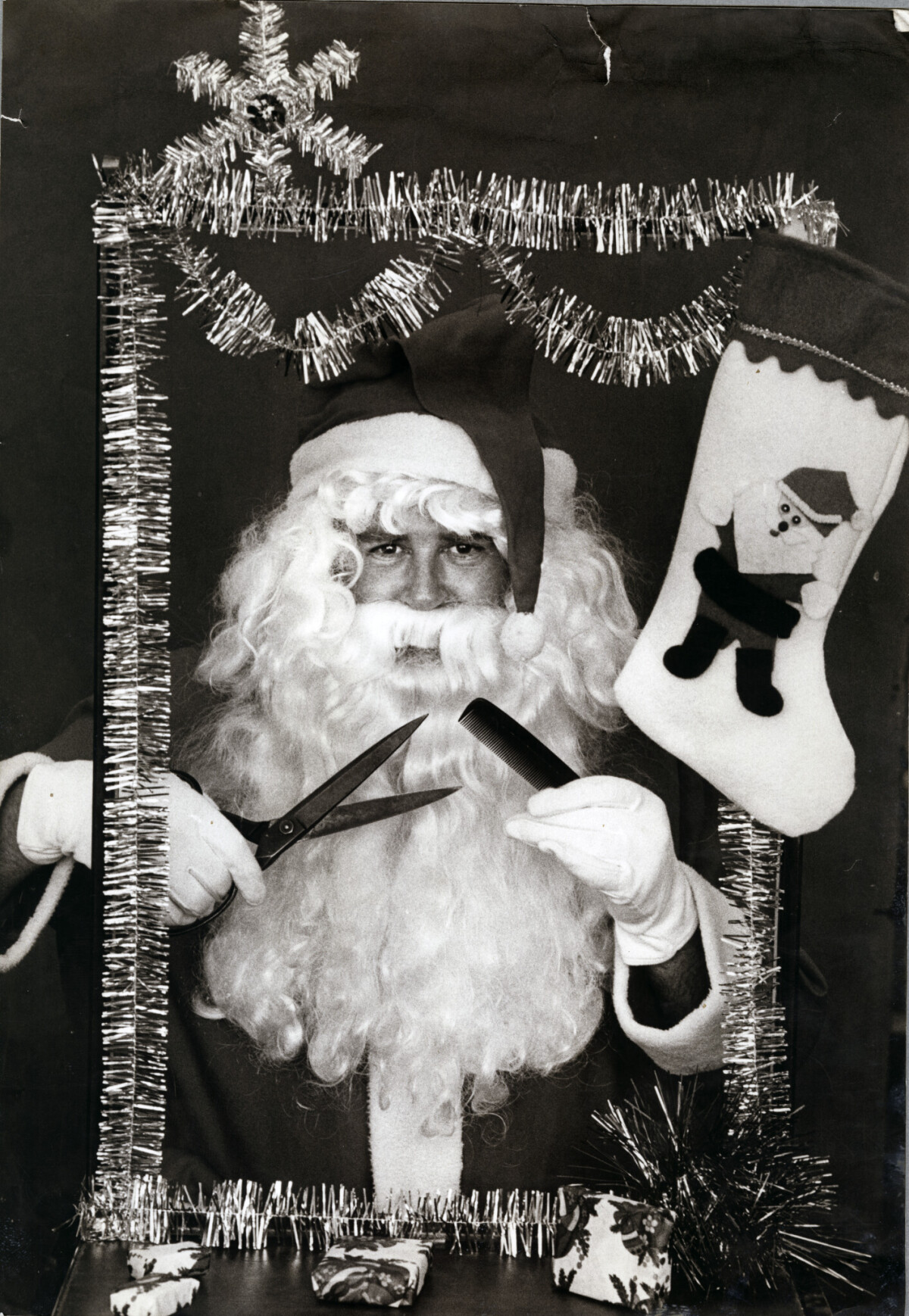 Santa Claus holding a comb and scissors and surrounded by Christmas decorations.