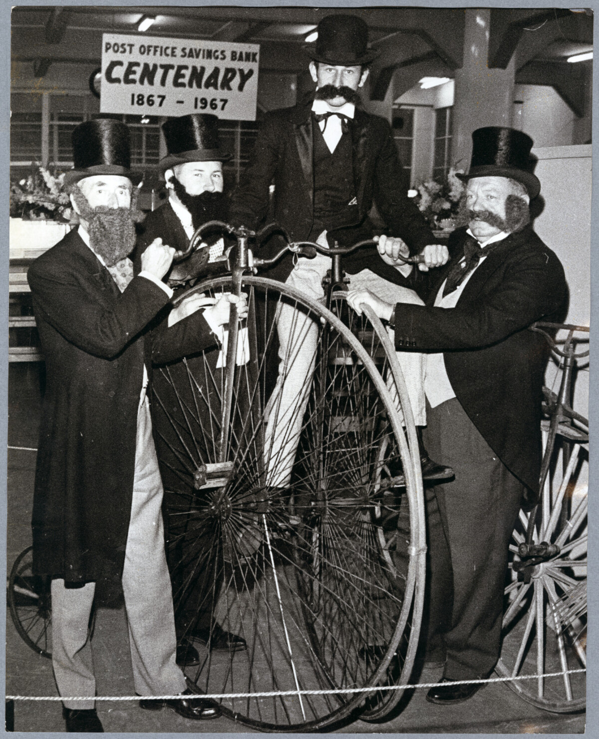 Men dressed in Victorian fashion with two penny farthings to celebrate the Post Office Savings Bank centenary. From left: Messrs D.J. Tierney (district savings officer), B.B. Wilson (senior clerk), C. Tooley (clerk) and O.R. Haddock.