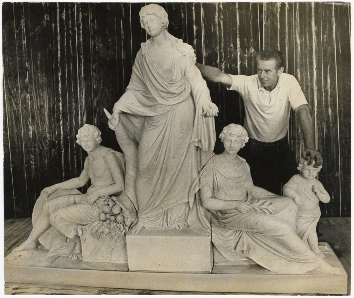 Mr R. Junk of R. J. Hampton Ltd with the newly restored Mother Amicus statue. The statue was formerly on top of the AMP building in Cathedral Square and was removed when the building was demolished. The statue will be installed on first floor frontage of the new AMP building on Worcester Street.