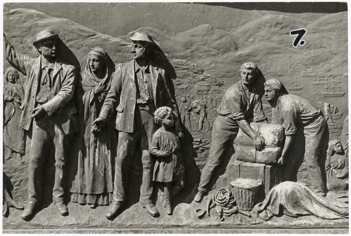 Bronze depiction of pilgrims landing at Lyttelton on the base of the Queen Victoria Statue in Victoria Square.