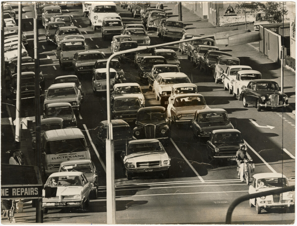Traffic jam on Kilmore Street ahead of a graduation ceremony at Christchurch Town Hall.