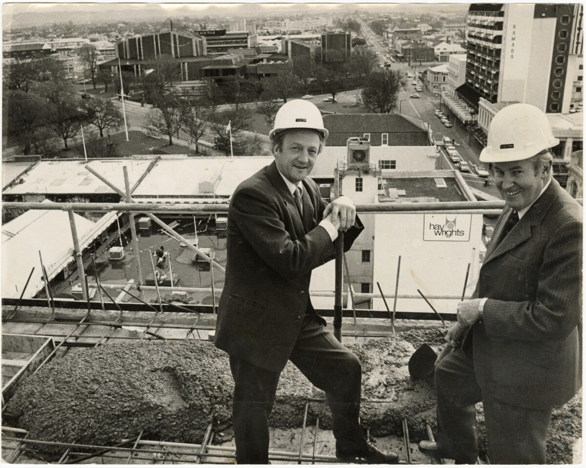 View from the Dominion Mutual Securities building during construction behind the Haywrights department store on Armagh Street. On the building is chairman the DMC superannuation fund, Mr P.W. Cotter (left) and the deputy chairman P.J.R. Skellerup.