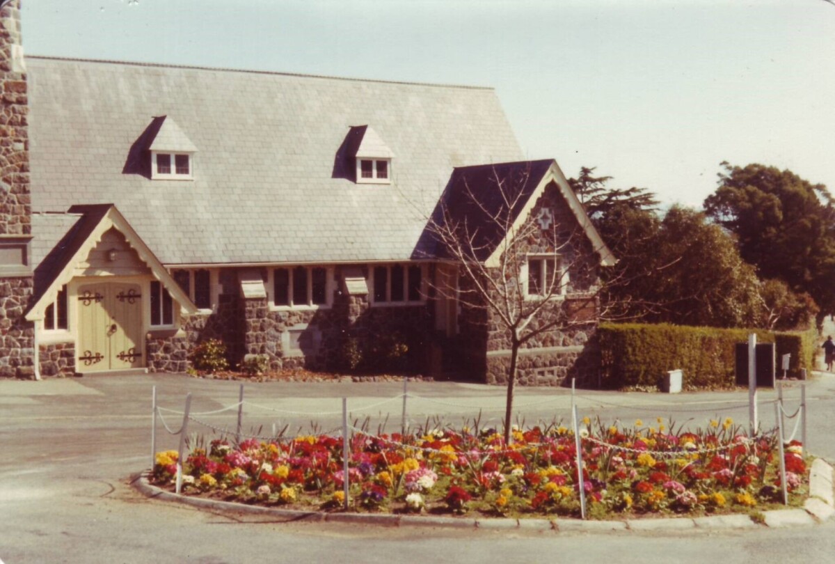 Cashmere Hills handsome stone Presbyterian church by " the Green" on Dyers Pass Road. Church was opened on 24th August 1929. Designed by Cecil Wood and Richard Harman in Gothic style with a slate roof. Built of Port Hills Basalt with pink Mount Somers stone round the doorways and white Oamaru stone around the windows. Information sourced from "The Port Hills of Christchurch" by Gordon Ogilvie