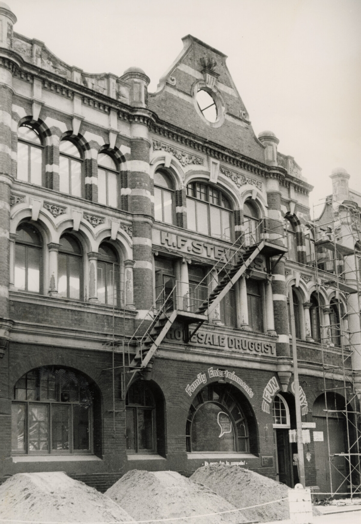Façade of the H. F. Stevens building on Worcester Street, on the north east of Cathedral Square during demolition.