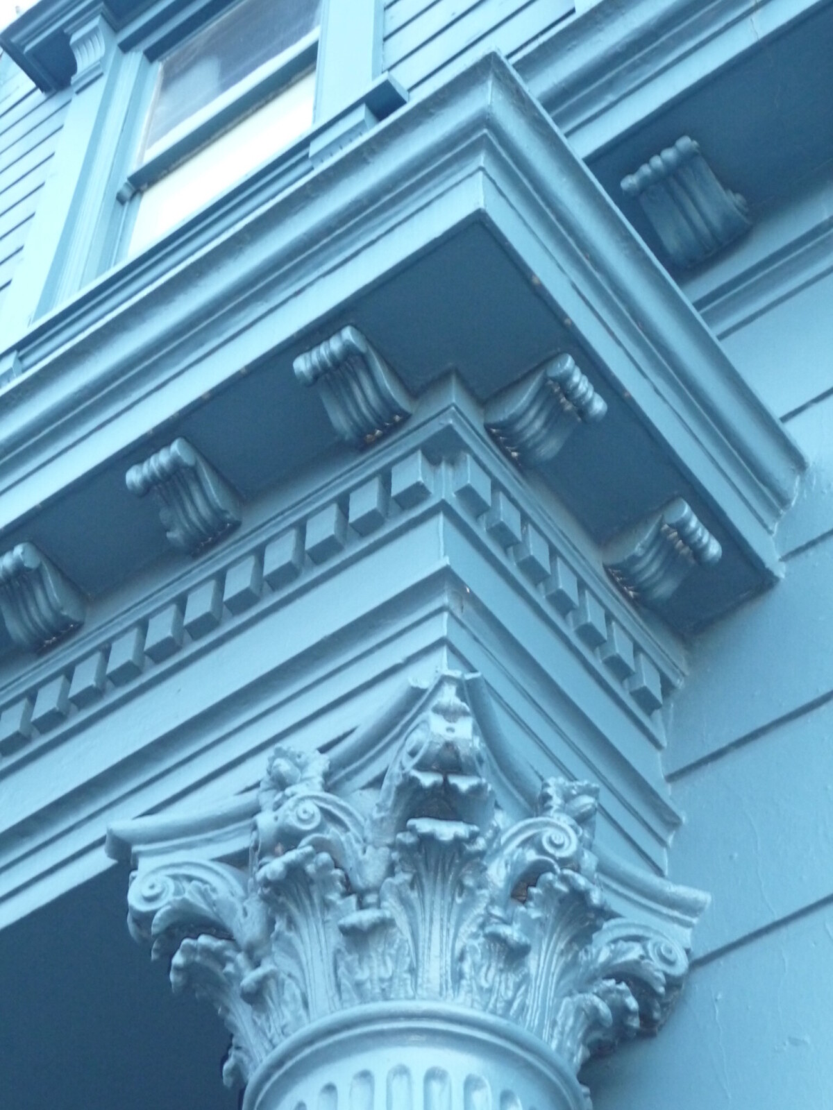 Closeup of Kilwinning Lodge architectural elements, showing Corinthian capital, dentil frieze and modillions.