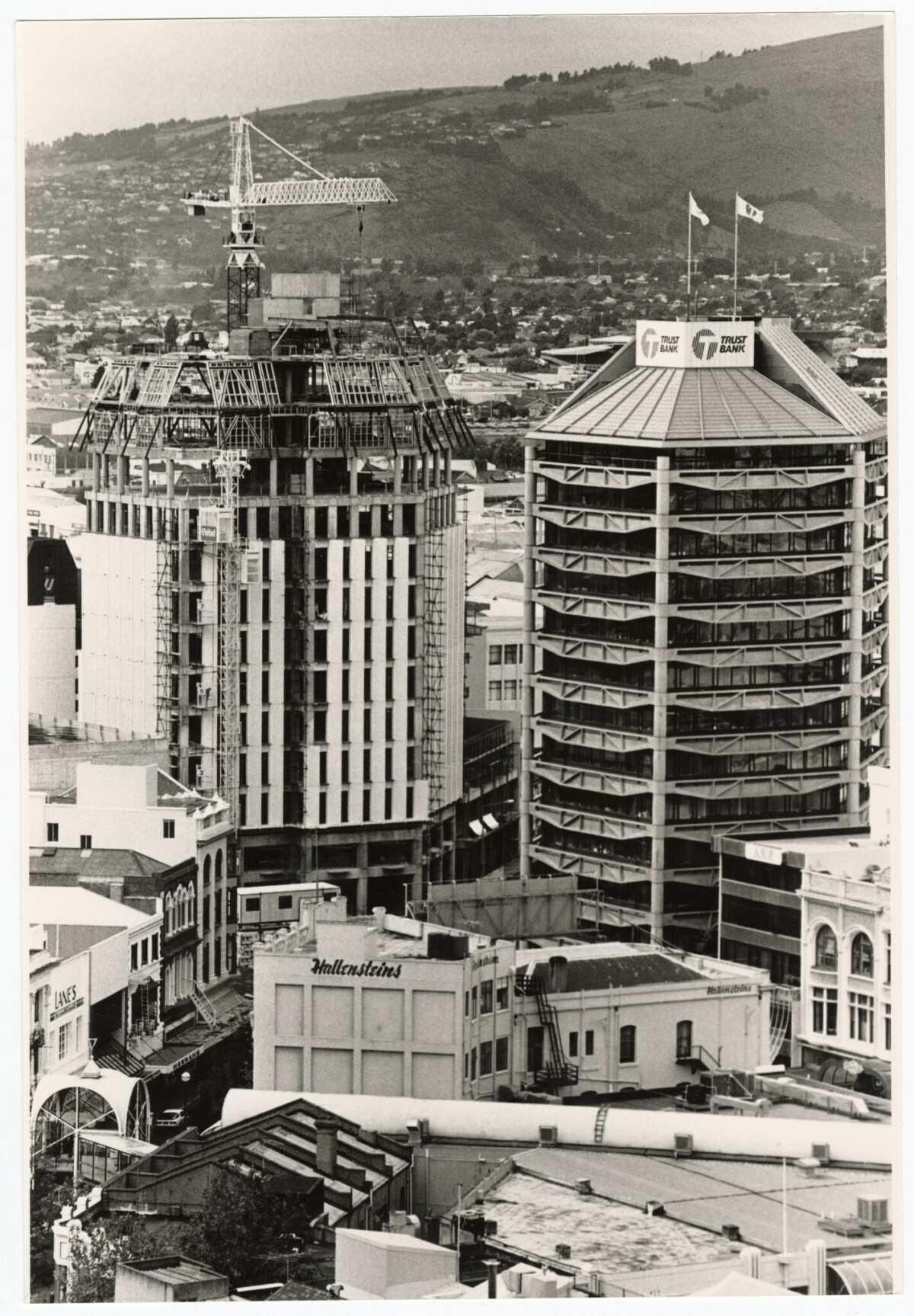 Buildings on the corner of High Street and Cashel Street including the Centra building under construction (left) and the Trust Bank building.