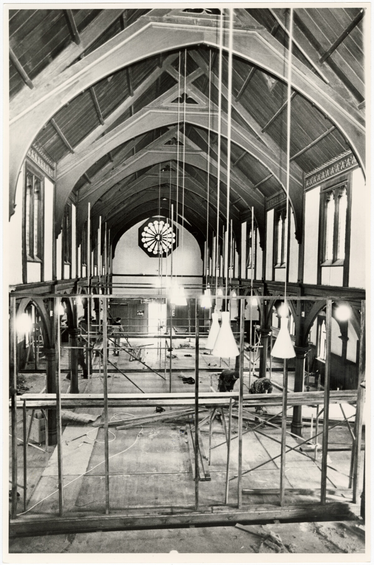 Interior view of St Andrew's Presbyterian Church during preparations for the moving of the church from Oxford Terrace to Rangi Ruru Girls School on Merivale Lane.