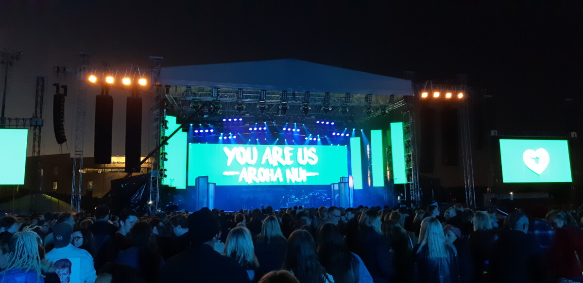 View of the stage and standing crowds waiting for the start of the You Are Us/Aroha Nui concert, a fundraiser for the victims of the Christchurch Mosque attacks, at the Christchurch Stadium in Addington.