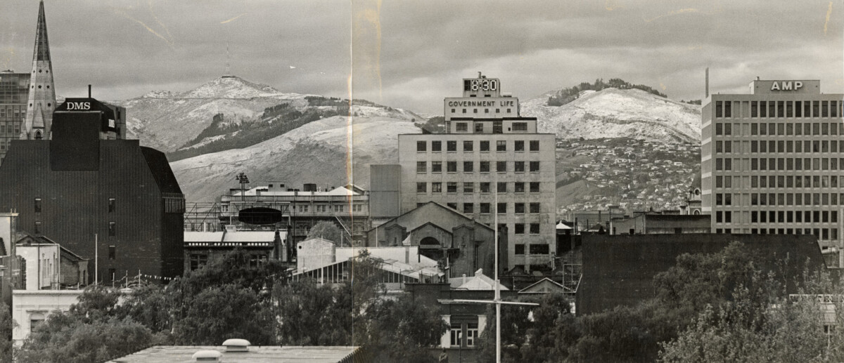 View of the central city, looking south towards the Government Life building in Cathedral Square and beyond to snow on the Port Hills.