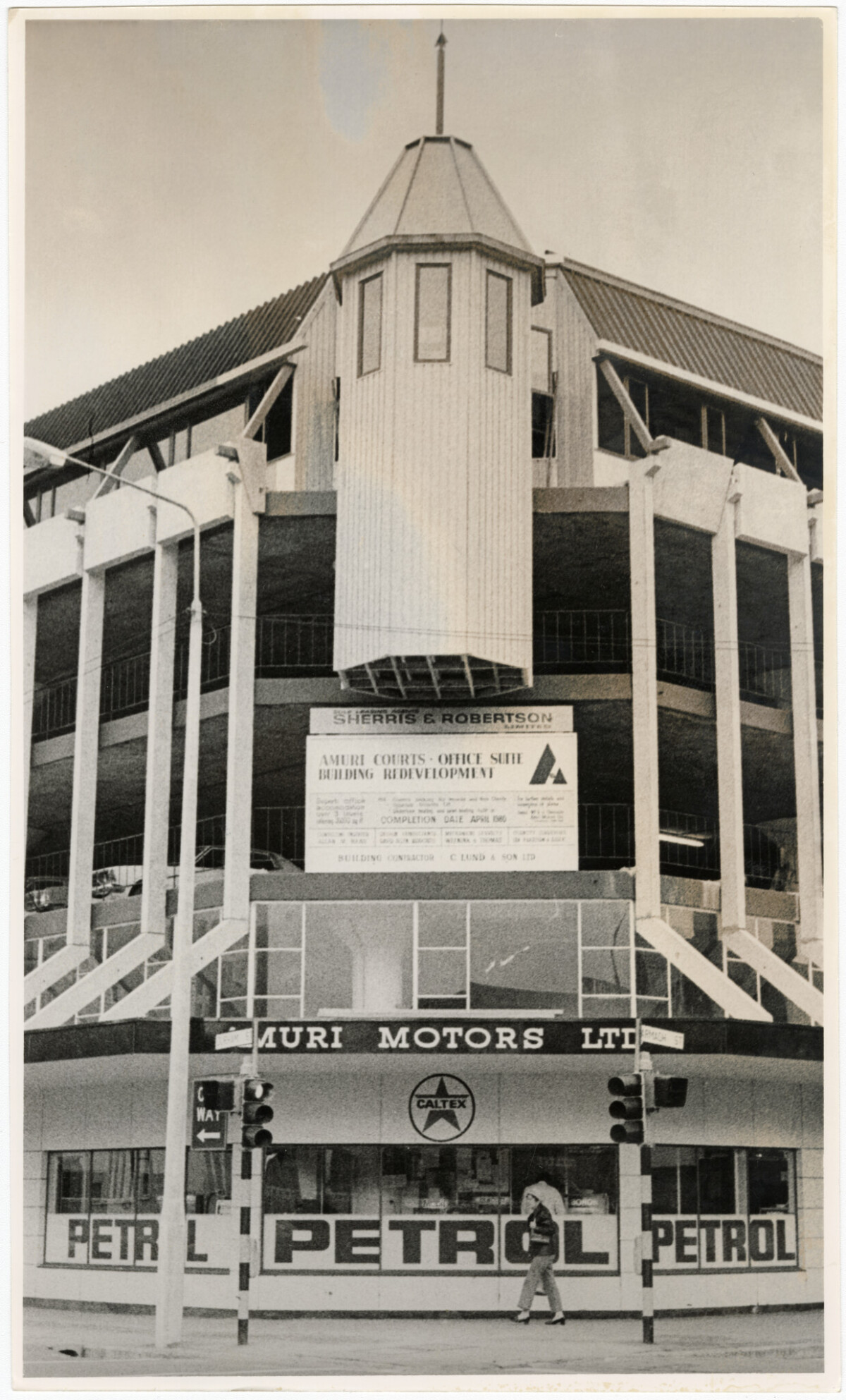 Tower addition to the Amuri Courts building on the corner of Durham and Armagh streets.