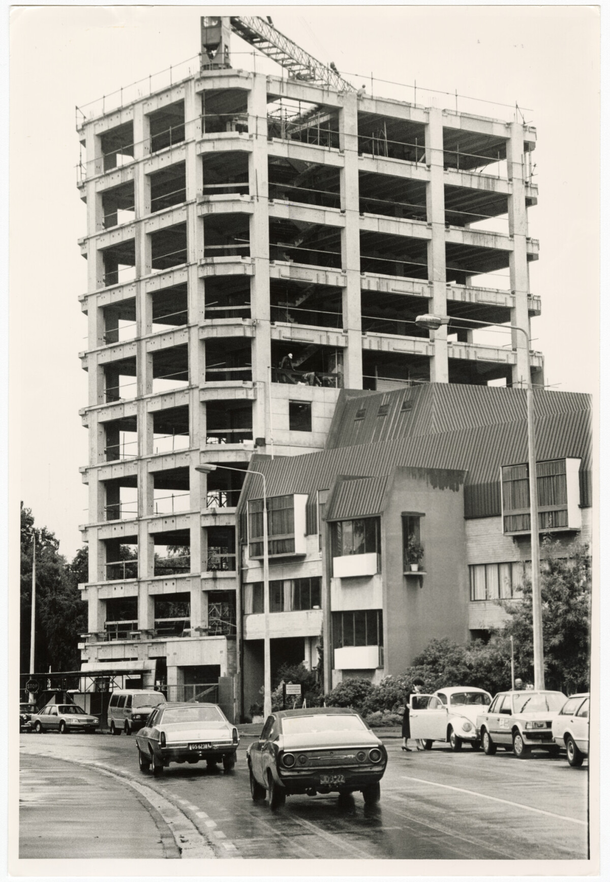 Construction of Victoria Towers on the corner of Armagh Street and Oxford Terrace.