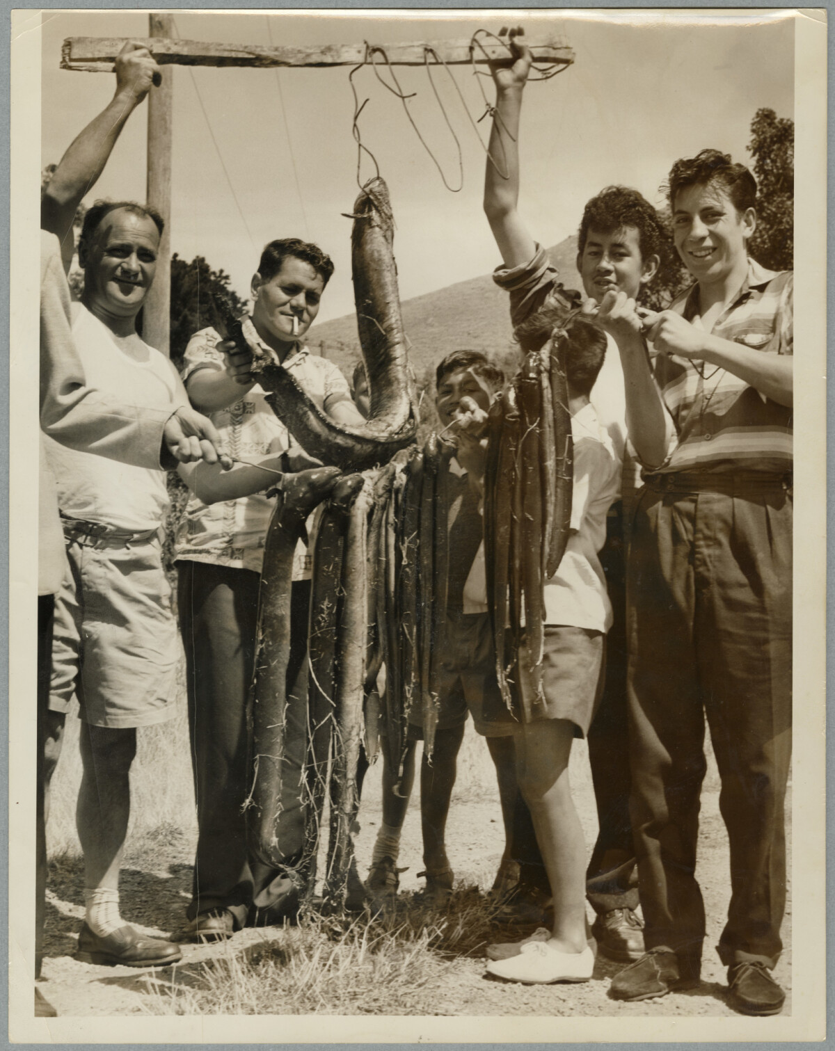 A group stringing up eels to dry as part of a gathering at Rapaki to celebrate the 120th anniversary of the Treaty of Waitangi.