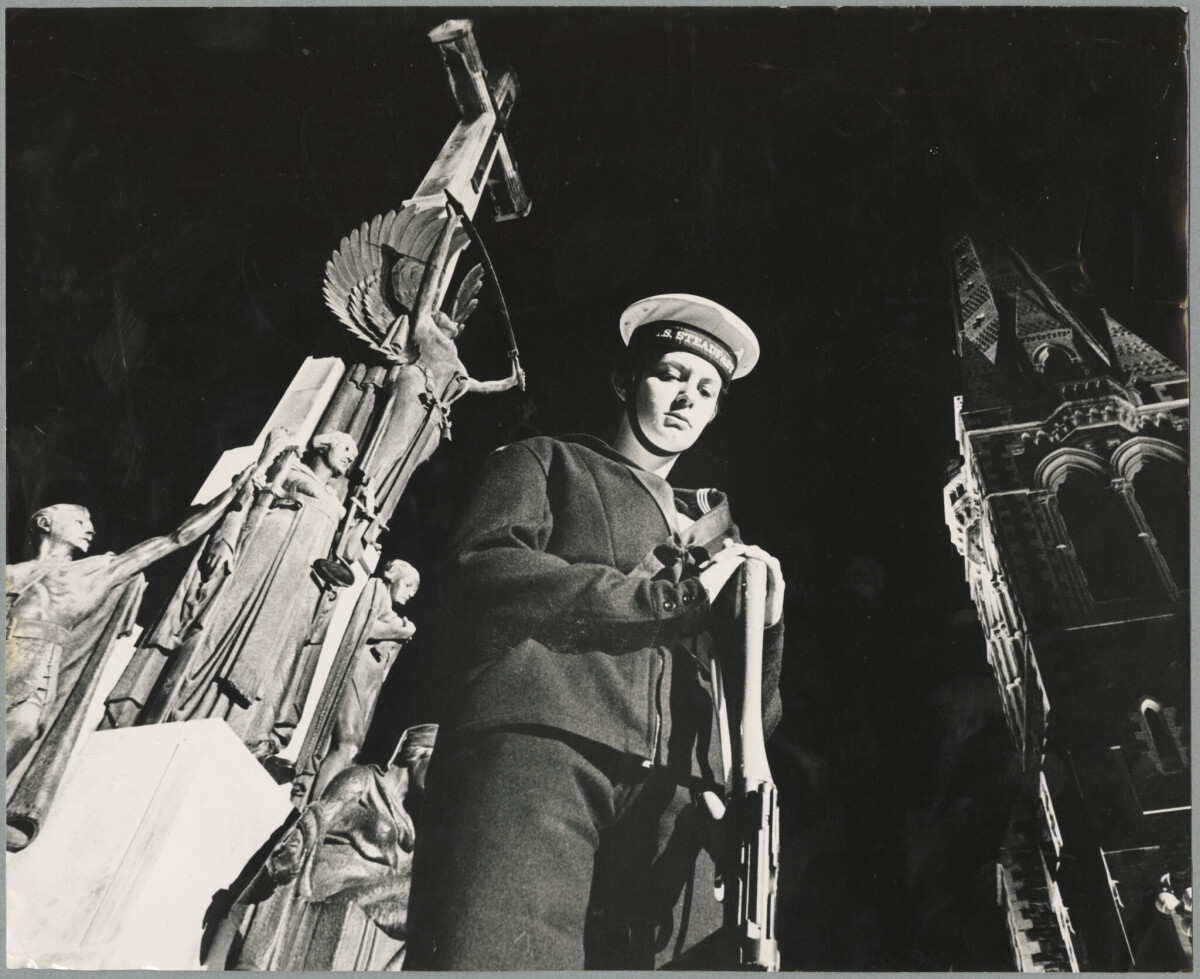Able cadet Tonia Robbins standing in rest-on-arms reverse position at the Citizens War Memorial in Cathedral Square, during the Anzac Day dawn service next to ChristChurch Cathedral.