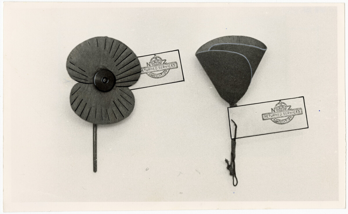 Close-up of two versions of Anzac poppies. The version on the right is the older one to be replaced by the one on the left due to its simpler design, making it easier to produce.