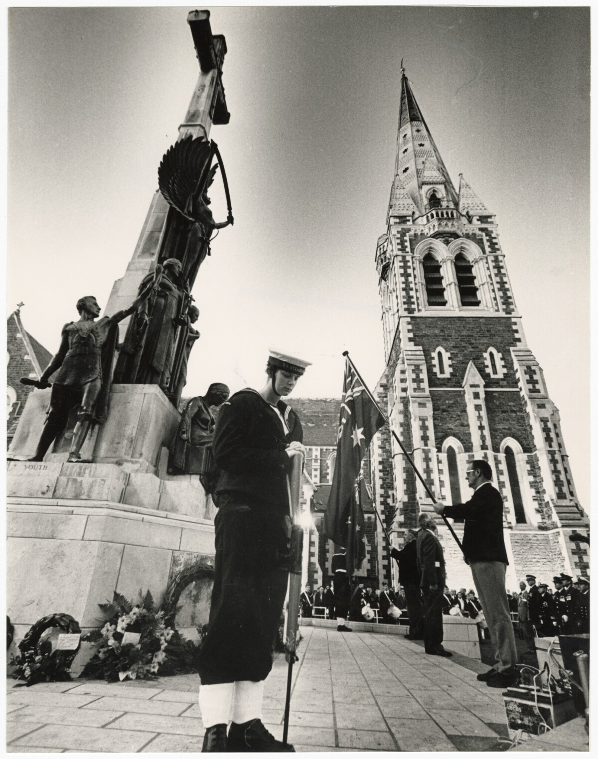 Fin and Arthur wearing uniform in Cathedral Square.