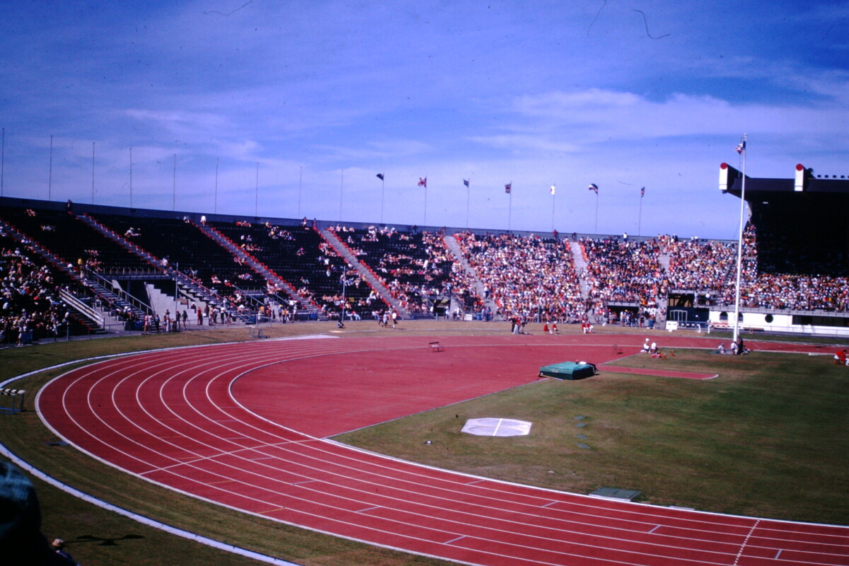 View of the stadium track at Queen Elizabeth II Park, during the 1974 British Commonwealth Games.