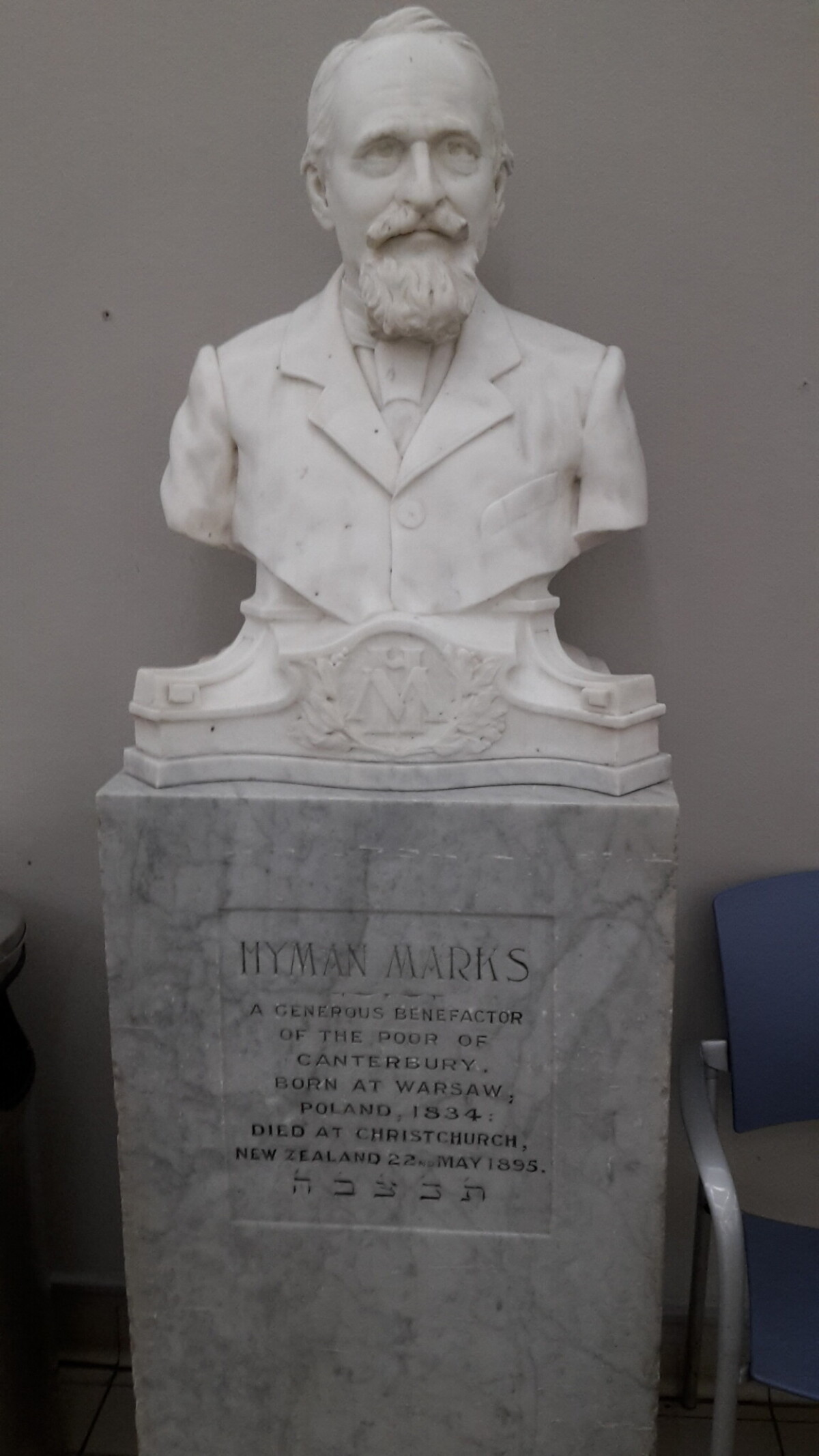 This memorial bust stands in the foyer of the main entrance to Christchurch Hospital. Inscription reads: Hyman Marks a generous benefactor of the poor of Canterbury. Born at Warsaw, Poland 1834. Died at Christchurch, New Zealand, 22nd May 1895. Inscribed on base W. Trethewey 1925.