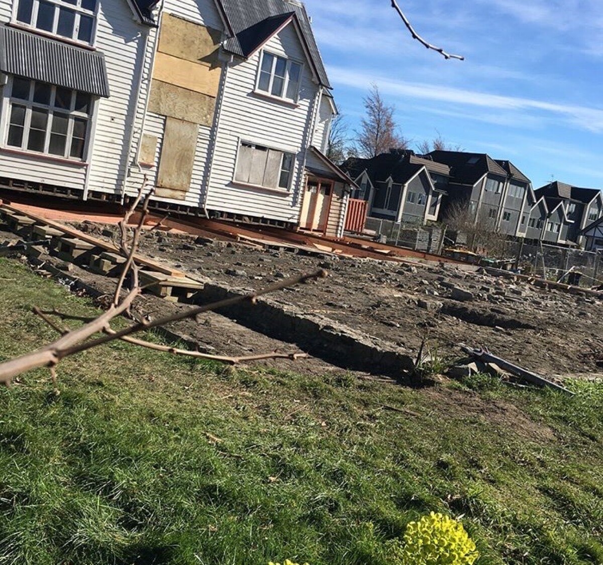 The Vicarage was lifted and pulled away from its original foundation, to replace it with new engineered foundations. The concrete ring and the large stones on top of the soil in the photo are the original foundations.