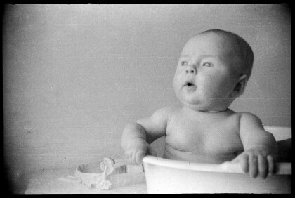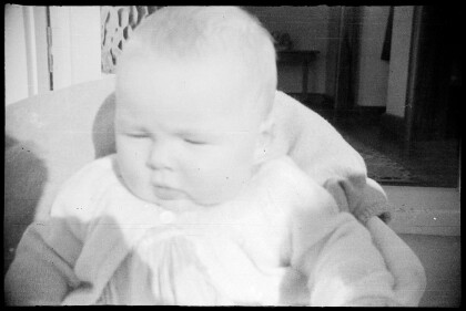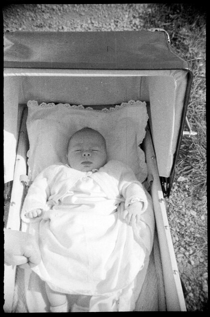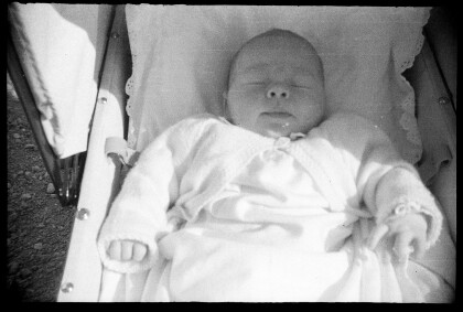 Yvonne Abernethy as a baby. She is sitting on a blanket on the ...