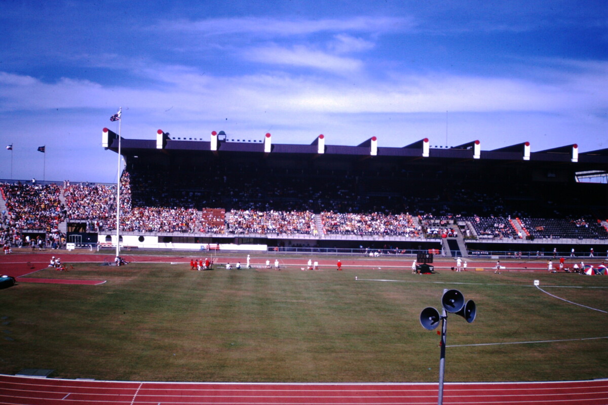 View of the stadium track at Queen Elizabeth II Park, during the 1974 British Commonwealth Games.