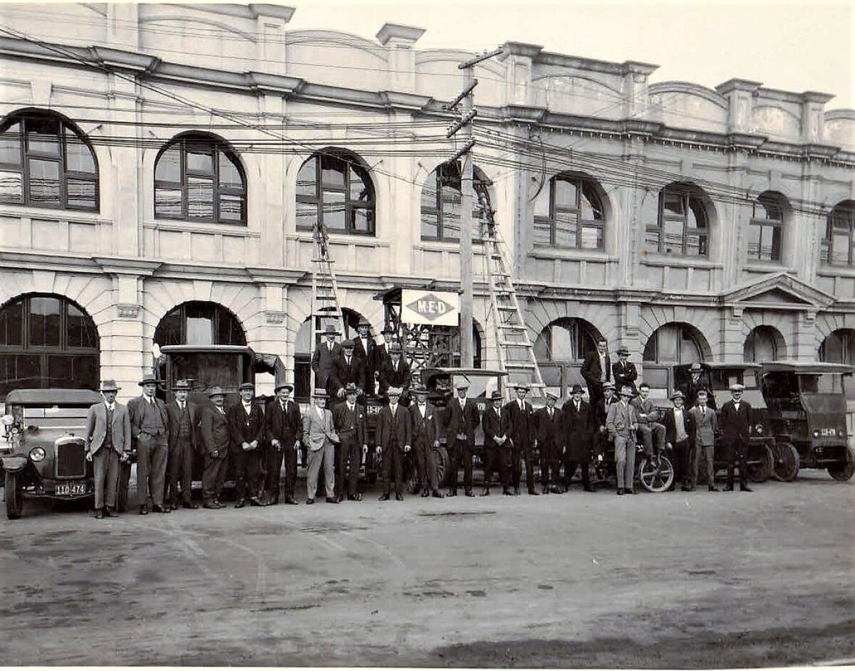 Municipal Electricity Department (MED), Manchester Street, Central Christchurch. Staff photo in 1930. MED was the electricity section of the Christchurch City Council. At that time they had about 200 trucks run by batteries. Maybe the MED was one of the first organizations in New Zealand to have a large fleet of electrically driven vehicles . Not such a new invention after all.